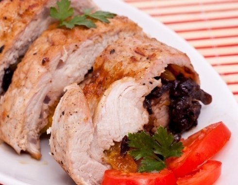 Сочная свиная вырезка, фаршированная черносливом, в обертке из бекона, подается со свежими овощами и соусом Demi Glace