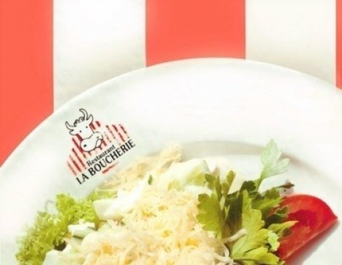 Листья салата, окорок, эмментальский сыр, зеленый горошек, яйцо, маринованные грибочки